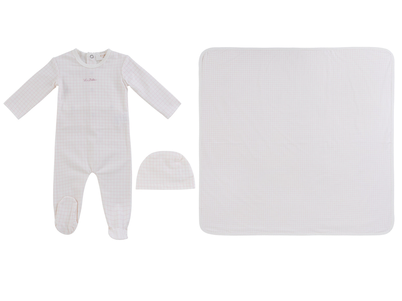 This includes a footie, hat, and matching blanket.